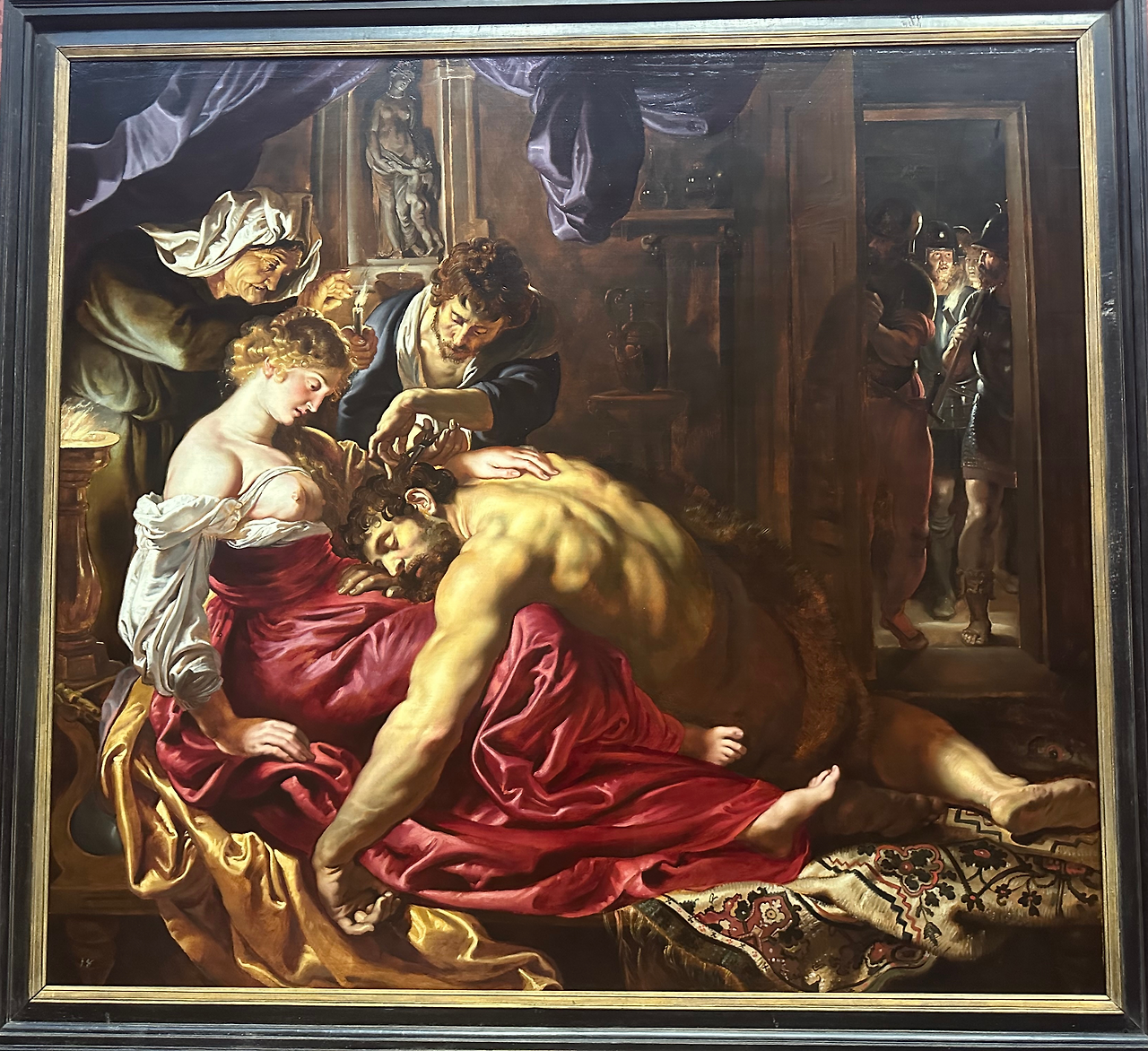 데릴라는 돈을 받고 삼손을 유혹하여 그의 힘의 근원을 알아내고 제거하는 목적을 가지고 접근한다. 삼손은 비밀을 알려주지 않으려 노력하지만, 결국 비밀을 말한다. 그리고 삼손이 잠든 사이, 힘의 근원이었던 머리카락을 자른다. 루벤스는 이 순간을 그림에 담았다. 데릴라의 표정은 무표정이고 차분해 보이지만 힘이 풀린 표정으로 삼손을 바라보고 있다. 삼손은 업어가도 모를 깊은 잠에 빠져있고, 표정은 평온하다. 삼손의 머리카락을 자르는 남자는 손가락에 한껏 힘이 들어갔고, 초를 들고 있는 여인은 손바닥으로 빛을 모은다. 이 순간에서 루벤스는 사랑과 배신이라는 인간적 갈등의 극치를 보여준다. 삼손이 데릴라의 무릎 위에 업드린 구도는 그녀에 대한 신뢰와 믿음을 표현하고, 데릴라의 붉은 벨벳의 옷은 권력과 매혹을 상징한다. 그리고 삼손의 등의 근육은 그가 지금이라도 일어나면 이 상황을 모두 정리할 듯 화가 나있지만, 그럴 수 없다는 의미를 더욱 깊게 만들어주고 있다.