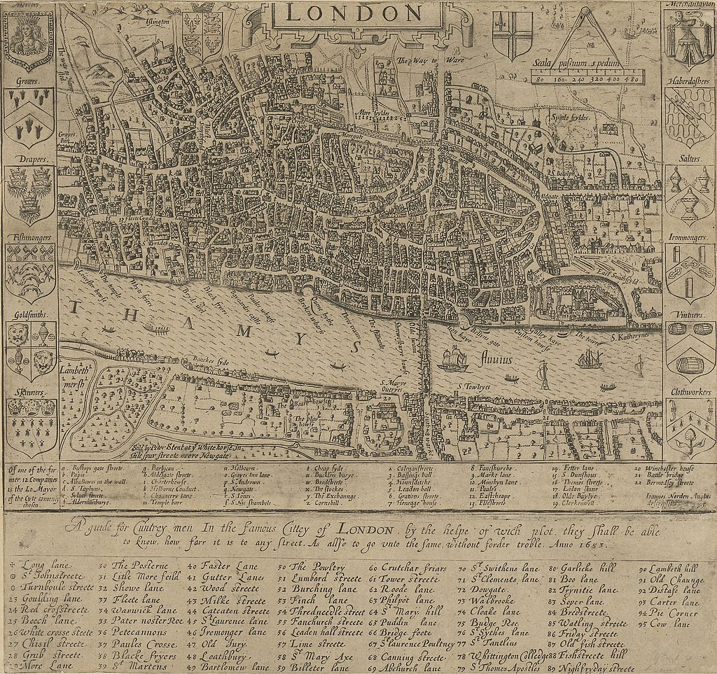 1593년 존 노던 John Norden은 '시골 사람을 위한 유명한 도시 런던 안내도; 이 지도가 있으면 어떤 장소든 그곳까지 거리를 알 수 있고 어떤 거리든 그곳까지 문제없이 갈 수 있음'이라는 제목이 엄청 긴 지도책을 펴냈다. 식료품점, 직물점, 생선가게와 템스 강에 다리와 랜드 마크들이 표시되어 있었다. 이 지도의 특징은 중요한 장소마다 알파벳과 숫자가 매겨져 있고, 지도 아래 그 이름들을 표기했다는 것이다. 이 특징은 현재 지도에도 쓰이는 방법이다. 당시 도시 지도는 빠르게 퍼져나간다. 앞서 언급했던 지도들은 세계 지도였다. 탐험을 위한, 권력을 과시하려는 상징이었다. 하지만 이 도시 지도들은 일반인들이 가질 수 있는 지도였다. 특히 상업하는 사람들의 지도로 사용되었다. 상점들의 위치와 거리 그리고 마케팅을 위한 용도로 사용된다. 1666년 대화재 사건 이후 새로 건설된 도시의 지도가 폭발적으로 증가한다.