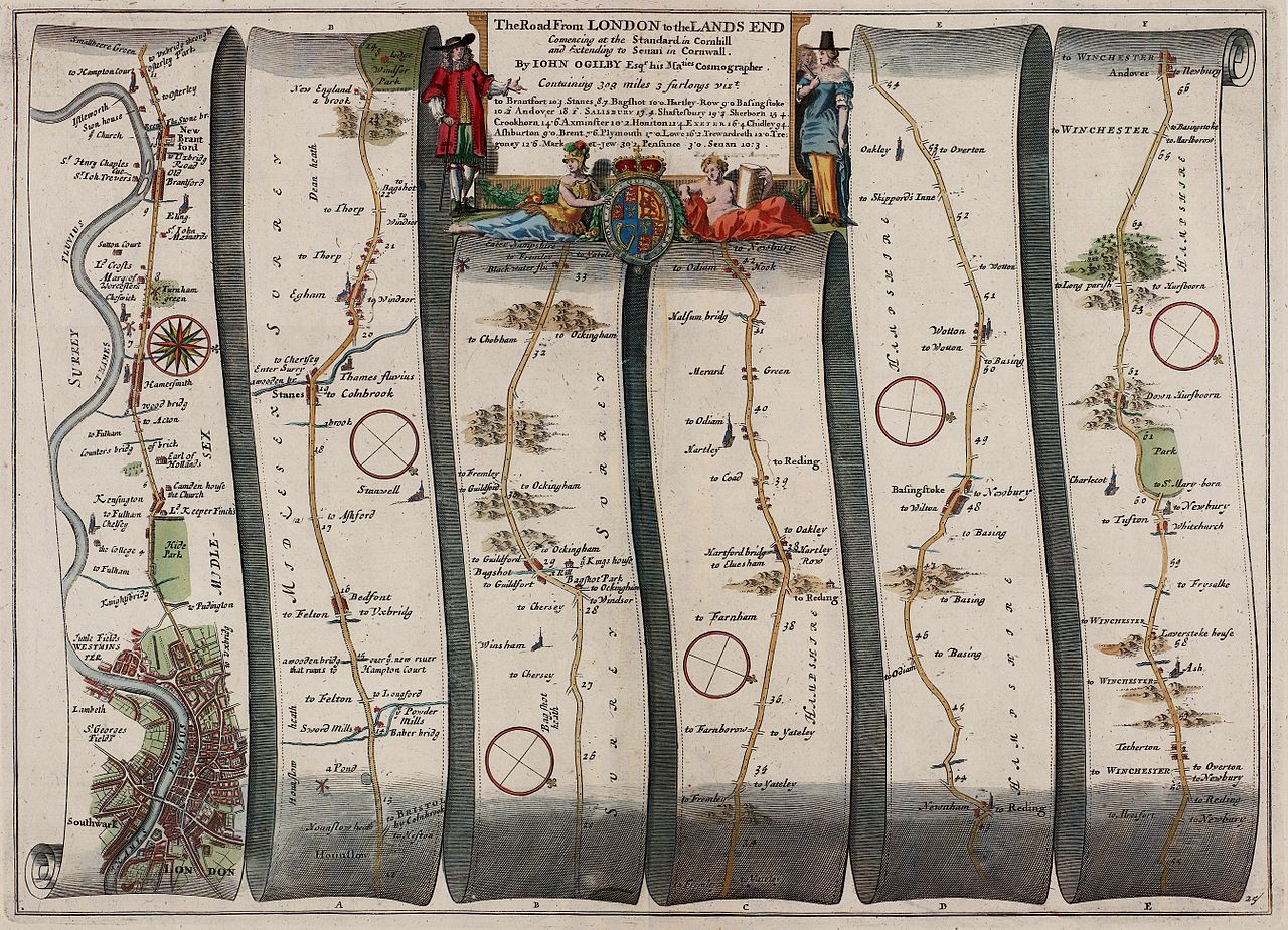 1675년 영국 최초의 로드 아틀라스(도로 지도집)인 '브리타니아'가 출판된다. 이 책은 당시 영국의 주요 도로와 교통로를 상세히 기록했으며, 각 도로의 길이, 주요 마을, 강, 그리고 교차로 등 표기된다. 이 책의 주인공은 존 오길비 John Ogilby이다. 스코틀랜드 출신의 저자, 번역가, 출판업자이자 지도 제작자로, 그는 영국 도로망의 아버지로 불리기도 하며, 그의 지도는 당대 지도 제작과 여행 문화를 혁신적으로 바꾼 인물이다. 원래는 무용수였지만 부상으로 번역가로 활동한다. 그의 번역작으로는 호메로스의 '일리아스'와 '오디세이'가 있다. 앞에 말한 1666년 대화재 이후, 지도 제작에 뛰어든다. 오 길비는 1인치당 1마일이라는 표준 척도를 사용해 지도를 제작했고, 이것은 영국 지도 제작의 기준이 된다. 이 지도의 특징은 스트립 맵 strip map이라는 스타일로 제작되었는데, 이는 도로를 따라 직선으로 진행하며 주변의 지형과 도시를 묘사하는 방식이다. 쉽게 말하자면 지금의 내비게이션 방식과 비슷하다고 생각하면 된다. 이 '브리타니아'는 이후 많은 지도 제작에 영감을 준다. 단순한 지도로 머물지 않고, 여행과 교통의 중요성 그리고 시각적인 편함을 구현하며 예술적 가치도 높았다.
